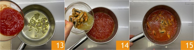 Geben Sie in einen Topf einen Schuss Öl, fügen Sie die Schalotte hinzu und dünsten Sie sie für einige Minuten. Geben Sie das Tomatenmark hinzu 13 und kochen Sie es 15 Minuten lang. Fügen Sie dann die Hälfte der Miesmuscheln hinzu 14 und lassen Sie es einige Minuten ziehen 15.