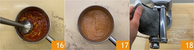 Pürieren Sie alles mit einem Stabmixer 16, bis Sie eine glatte und homogene Sauce erhalten 17. Legen Sie sie beiseite. Rollen Sie den Teig in Platten von 2 mm Dicke aus 18.