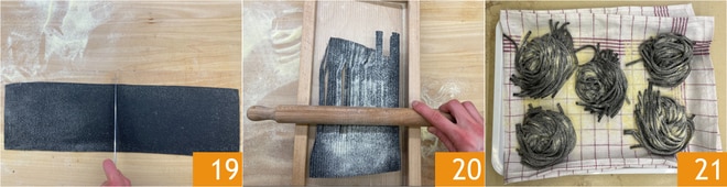 Schneiden Sie die Platten in kleinere Rechtecke 19 und legen Sie sie auf die Chitarra, dann schneiden Sie sie, indem Sie mit dem Nudelholz darüber rollen 20. Legen Sie die Spaghetti alla chitarra auf ein sauberes mit Grieß bemehltes Geschirrtuch 21.