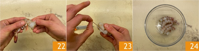 In der Zwischenzeit reinigen Sie die Garnelen: Entfernen Sie Kopf, Panzer 22 und Darm 23, dann sammeln Sie das Fleisch in einer Schüssel 24.