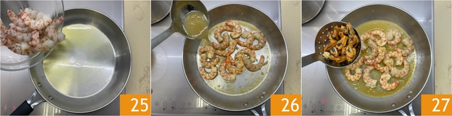 Geben Sie in eine Pfanne einen Schuss Öl, fügen Sie die Garnelen hinzu 25 und braten Sie sie einige Minuten an, löschen Sie dann mit der Kochflüssigkeit der Miesmuscheln ab 26. Fügen Sie auch die restlichen Miesmuscheln hinzu 27 und kochen Sie sie einige Minuten, gerade genug, um die Zutaten zu vermischen.