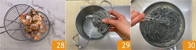 Übertragen Sie Miesmuscheln und Garnelen in eine Schüssel 28 und lassen Sie die Kochflüssigkeit in der Pfanne, sie wird später benötigt. Kochen Sie die Spaghetti in reichlich gesalzenem kochendem Wasser 29, seihen Sie sie ab und geben Sie sie in die Pfanne, in der Sie die Miesmuscheln und Garnelen gekocht haben 30.