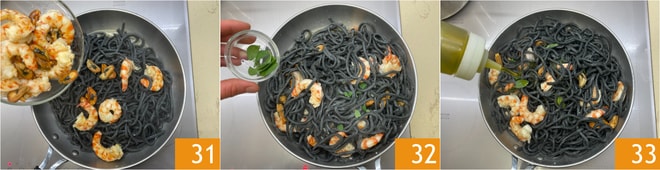 Fügen Sie die Miesmuscheln und Garnelen hinzu 31, einige frische Majoranblätter 32 und mischen Sie mit einem Schuss Öl 33.