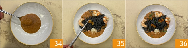 Geben Sie auf den Boden des Tellers die Muschelcreme 34, legen Sie die Spaghetti als Nest verteilt und garnieren Sie mit Garnelen, Miesmuscheln 35 und einigen Majoranblättern. Die Spaghetti alla chitarra mit Sepia-Tinte, Miesmuscheln und Garnelen sind bereit, serviert zu werden 36!