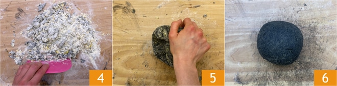Vermengen Sie die Mischung zunächst mit einer Teigkarte 4 und kneten Sie dann mit den Händen weiter 5, bis Sie einen glatten und homogenen Teig erhalten 6. Wickeln Sie diesen in Frischhaltefolie und lassen Sie ihn 30 Minuten im Kühlschrank ruhen.