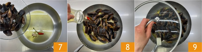 Geben Sie in eine Pfanne einen Schuss Öl, fügen Sie die Chilischote, den Knoblauch und die Miesmuscheln hinzu 7. Löschen Sie mit Weißwein ab 8 und decken Sie mit einem Deckel ab 9, dann kochen Sie, bis sie sich geöffnet haben.