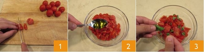 Um die Spaghetti mit Miesmuscheln nach katalanischer Art zuzubereiten, beginnen Sie mit den Kirschtomaten. Waschen Sie sie unter fließendem kaltem Wasser und trocknen Sie sie ab. Entfernen Sie den grünen Stiel und schneiden Sie sie in Viertel 1. Geben Sie sie in eine Schüssel, würzen Sie mit Salz und fügen Sie einen Schuss Öl hinzu 2. Zerteilen Sie die Basilikumblätter grob 3 und stellen Sie sie beiseite.