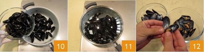 Geben Sie sie in einen Antihafttopf 10, erhitzen Sie sie bei starker Hitze und mit Deckel 11 und warten Sie, bis sich die Miesmuscheln öffnen, indem Sie gelegentlich umrühren: Dies dauert etwa 7-8 Minuten. Sobald sie fertig sind, bewahren Sie die Kochflüssigkeit auf, öffnen Sie dann die Miesmuscheln und entnehmen Sie die Muscheln 12.