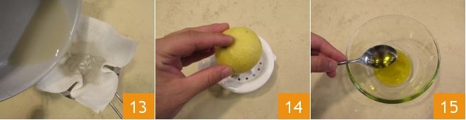 Filtern Sie die Flüssigkeit der Miesmuscheln mit einem auf eine Schüssel gelegten Mulltuch 13, Sie sollten 740 g erhalten. Drücken Sie nun eine Zitrone aus 14 und geben Sie den Saft in eine kleine Schüssel. Fügen Sie das Olivenöl hinzu 15,