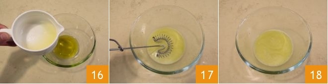 und 40 g der Kochflüssigkeit der Miesmuscheln 16; mit einem flachen Schneebesen emulgieren Sie die Zutaten 17, bis Sie eine homogene Mischung erhalten 18.