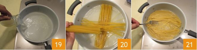 Gießen Sie die restlichen 700 g der Kochflüssigkeit der Miesmuscheln in einen großen Topf zusammen mit kaltem Wasser 19. Bringen Sie es zum Kochen und lassen Sie die Spaghetti risottieren, indem Sie sie gleichmäßig im Topf verteilen 20. Lassen Sie das Kochwasser vollständig verdunsten, indem Sie die Spaghetti gelegentlich umrühren, damit sie nicht anhaften 21.