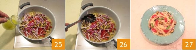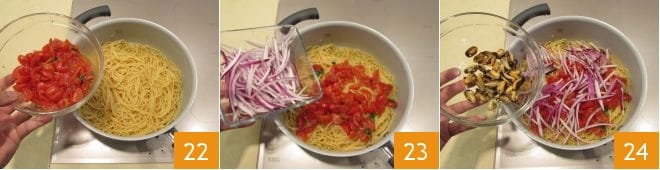 Wenn noch 3 Minuten bis zum Ende der Garzeit fehlen, fügen Sie die Kirschtomaten 22, die abgetropften Zwiebeln 23 und die Miesmuscheln 24 hinzu.
