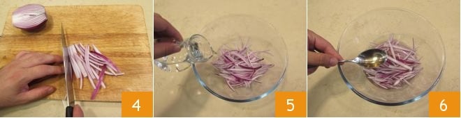 Schälen und putzen Sie die Zwiebel, schneiden Sie sie dann in Spalten und anschließend in dünne Streifen 4. Geben Sie sie für etwa 10 Minuten in eine Schüssel mit kaltem Wasser 5 und Essig 6.