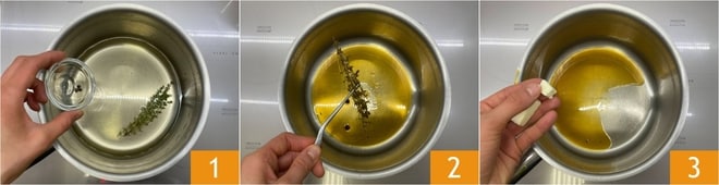 Um die Spaghetti mit schwarzem Knoblauchcreme, Lakritze und Haselnüssen zuzubereiten, bereiten Sie zuerst die saure Butter zu: Geben Sie den Weißwein in einen kleinen Topf, dann fügen Sie die Thymianzweige und die Pfefferkörner hinzu 1. Drehen Sie den Herd auf und lassen Sie es bei starker Hitze reduzieren, bis der gesamte Alkohol verdampft ist. Dann schalten Sie den Herd aus, entfernen den Thymian und den Pfeffer 2 und fügen ein paar Würfel kalte Butter aus dem Kühlschrank hinzu 3.