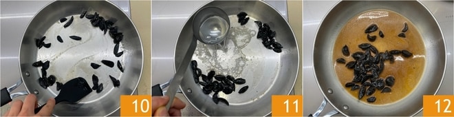 Braten Sie sie kurz an 10, dann geben Sie eine Kelle kochendes Wasser hinzu 11 und lassen sie weitere 2-3 Minuten ziehen 12.