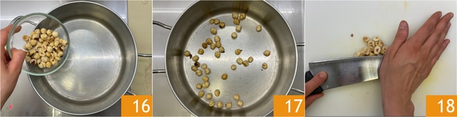 Bewahren Sie die Creme auf und kümmern Sie sich um die Haselnüsse: Geben Sie sie in eine Pfanne 16 und rösten Sie sie bei mittlerer bis niedriger Hitze 17. Wenn sie gut gebräunt sind, hacken Sie sie grob, indem Sie mit der Messerklinge darauf drücken 18.