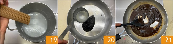 Salzen Sie dann das kochende Wasser und kochen die Vollkornspaghetti 2 Minuten kürzer als auf der Packung angegeben 19. In der Zwischenzeit gießen Sie die schwarze Knoblauchcreme in die Pfanne 20 und verdünnen sie mit einer Kelle des Nudelkochwassers 21.