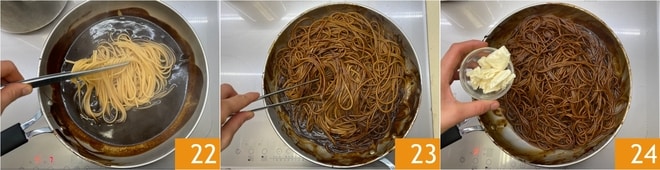 Gießen Sie die Spaghetti in die Pfanne mit der Sauce 22, mischen und garen sie bis zur gewünschten Konsistenz 23. Sobald die Pasta fertig ist, schalten Sie den Herd aus und fügen einen Löffel kalte saure Butter aus dem Kühlschrank hinzu 24. Rühren Sie alles gut um und richten Sie an.