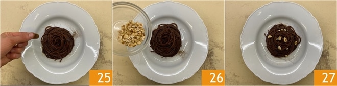 Vervollständigen Sie die Teller mit einer Prise Lakritzpulver 25 und den gerösteten Haselnüssen 26. Ihre Spaghetti mit schwarzem Knoblauchcreme, Lakritze und Haselnüssen sind bereit zum Servieren 27!