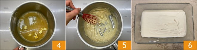 Schwenken Sie den kleinen Topf, um die Butter zu schmelzen 4, dann fügen Sie die restliche Butter nach und nach hinzu und verfahren Sie auf die gleiche Weise; während das Volumen der Mischung zunimmt, helfen Sie sich mit einem Schneebesen zum Mischen 5. Wenn die gesamte Butter geschmolzen ist, geben Sie die entstandene Creme in einen flachen, breiten Behälter 6 und lassen sie im Kühlschrank abkühlen.