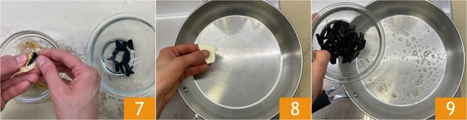 Stellen Sie einen Topf mit Wasser auf den Herd, um die Pasta zu kochen, und kümmern Sie sich um die Knoblauchcreme: Schälen Sie die Köpfe des schwarzen Knoblauchs und entnehmen Sie die Zehen 7. Lassen Sie ein Stück Butter in einer Pfanne schmelzen 8, dann fügen Sie die Knoblauchzehen hinzu 9.