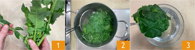 Um die Spaghetti mit Rübstielcreme, Nduja und Stracciatella vorzubereiten, trennen Sie zuerst die Rübstielröschen und Blätter vom Stiel 1. Blanchieren Sie sie für einige Sekunden in leicht gesalzenem kochendem Wasser 2, dann abtropfen lassen und in Eiswasser tauchen 3, um den Kochvorgang zu stoppen und die Farbe zu bewahren. Bewahren Sie das Kochwasser auf, es wird später zum Kochen der Pasta benötigt.