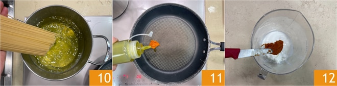 Kochen Sie die Spaghetti im Kochwasser der Rübstiele 10. In der Zwischenzeit geben Sie 10 g Nduja mit einem Schuss Öl in eine antihaftbeschichtete Pfanne 11 und lassen Sie sie bei sehr niedriger Hitze schmelzen. In der Zwischenzeit geben Sie die Stracciatella und 30 g Nduja in einen Behälter 12.