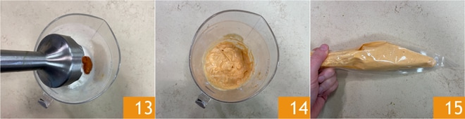 Mischen Sie 13, bis eine homogene Creme entsteht 14, dann in einen Spritzbeutel umfüllen 15.