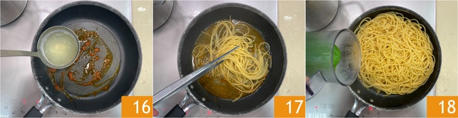 Gießen Sie eine Kelle vom Kochwasser der Pasta in die Pfanne 16, dann die Spaghetti al dente abgießen 17. Fügen Sie die Rübstielcreme hinzu 18 und noch eine Kelle vom Kochwasser, dann alles kurz schwenken, um die Sauce zu vermischen.