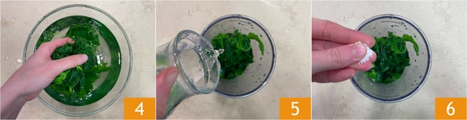 Die Rübstiele gut abtropfen lassen und ausdrücken 4, dann in einen Behälter geben. Fügen Sie etwas Wasser hinzu 5 und würzen Sie mit Salz und Pfeffer 6.