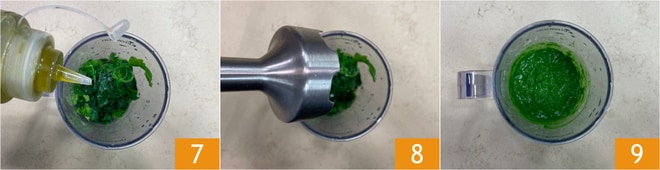 Das Öl hinzufügen 7 und mit einem Stabmixer pürieren 8, bis eine glatte und homogene Creme entsteht 9.
