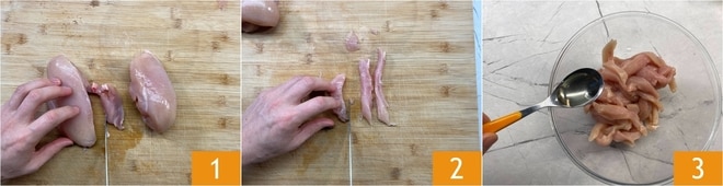 Reinigen Sie die Hähnchenbrust von Fett und Knochen 1, schneiden Sie sie in Stücke 2 und würzen Sie sie in einer Schüssel mit der Hälfte der Menge des Pflanzenöls 3,