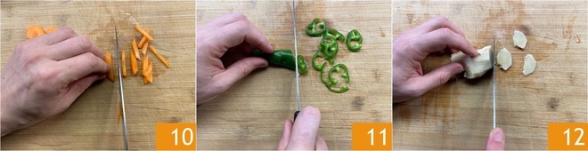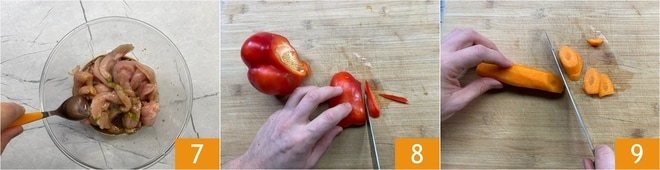 Vermischen Sie alles 7 und stellen Sie es beiseite. Bearbeiten Sie das Gemüse, indem Sie die Paprika in Stifte schneiden 8, die Karotten zuerst in Scheiben 9