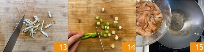 und dann in Streifen 13. Schneiden Sie die Frühlingszwiebel in Ringe 14. Erhitzen Sie einen Wok oder eine Antihaftpfanne gut und geben Sie das gewürzte Huhn hinein 15.
