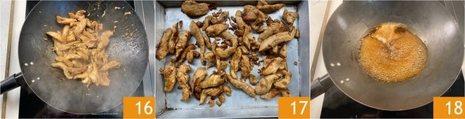 Halten Sie eine mittelhohe Temperatur 16 und nach etwa 8 Minuten, während Sie das Huhn oft im Wok schwenken, erhalten Sie ein schön gebräuntes Fleisch 17. Legen Sie das Huhn auf ein Backblech. Um Speisereste aus dem Wok zu entfernen, geben Sie einfach etwas heißes Wasser hinzu und lassen es einige Momente kochen 18.