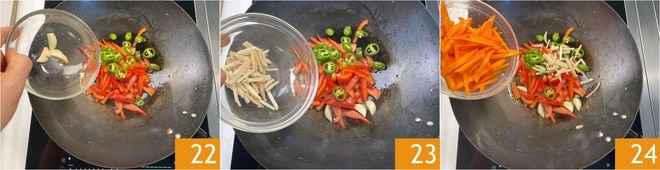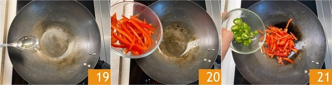 Gießen Sie das Pflanzenöl in den Wok 19, halten Sie stets eine mittlere bis hohe Temperatur und geben Sie die Paprika 20, die grüne Chili 21,