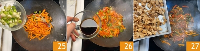 die Frühlingszwiebel 25 und braten Sie das Gemüse unter häufigem Schwenken für 7 Minuten. Würzen Sie mit Sojasauce 26 und rühren Sie weiter. Fügen Sie das Huhn zum Gemüse hinzu 27,