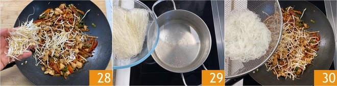 vermischen Sie es gut, um die Zutaten zu kombinieren. Fügen Sie die Sojasprossen hinzu 28 und stellen Sie sie beiseite. Lassen Sie nun in einem Topf reichlich Wasser aufkochen, dann schalten Sie das Feuer aus und geben die Soja-Spaghetti hinein 29. Lassen Sie sie 3 Minuten rehydrieren, dann geben Sie die Spaghetti direkt in den Wok 30.