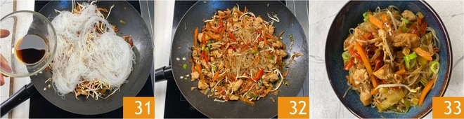 Würzen Sie nach Belieben mit Sojasauce 31 und kochen Sie eine letzte Minute bei hoher Hitze 32. Ihre Soja-Spaghetti auf orientalische Art sind fertig 33, Sie müssen sie nur noch heiß genießen!