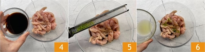 die Sojasauce 4, die Schale 5 und den Limettensaft 6.