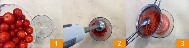 Um die Spaghetti mit frischen Tomaten, Basilikum und Stracciatella zuzubereiten, waschen Sie die Kirschtomaten und pürieren Sie sie dann mit einem Stabmixer 1 2. Sobald Sie eine glatte Creme erhalten haben, seihen Sie sie mit einem feinen Sieb ab und helfen Sie sich dabei mit einem Löffel 3. Beiseite stellen.