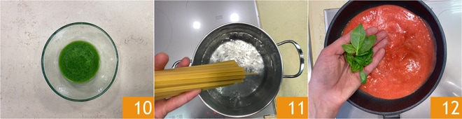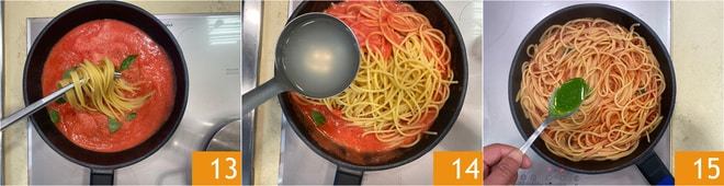 Seihen Sie die Spaghetti ab (und halten Sie etwas Kochwasser zurück) in die Pfanne mit der Soße 13 und schalten Sie erst dann den Herd ein. Beenden Sie das Kochen der Pasta in der Pfanne, indem Sie eine Kelle Kochwasser hinzufügen 14. Am Ende des Kochvorgangs fügen Sie das Basilikumöl hinzu 15 und mischen alles gut durch.