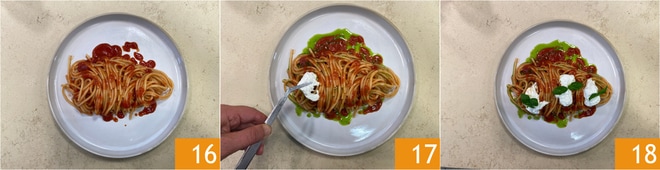 Richten Sie die Spaghetti an, indem Sie weitere Tomatensoße hinzufügen 16, einen Schuss Basilikumöl und einige Stracciatella-Flocken 17. Die Spaghetti mit frischen Tomaten, Basilikum und Stracciatella sind bereit zum Genießen 18!