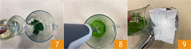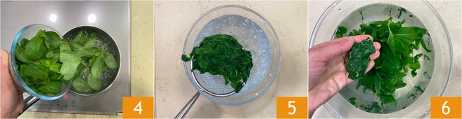 Gehen Sie nun zum Basilikumöl über: Blanchieren Sie die Blätter 30 Sekunden lang in kochendem Wasser 4, dann abseihen und in eine Schüssel mit Wasser und Eis geben 5, damit die leuchtende Farbe erhalten bleibt. Jetzt die Blätter ausdrücken 6.