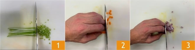 Um die Spaghetti mit Ragout und Fleischbällchen zuzubereiten, beginnen Sie mit dem Waschen und Putzen des Gemüses für den Soffritto des Ragouts: Schneiden Sie den Sellerie 1 und die Karotte 2 in Stifte und hacken Sie sie fein, dann machen Sie dasselbe mit der Zwiebel 3.