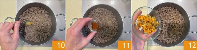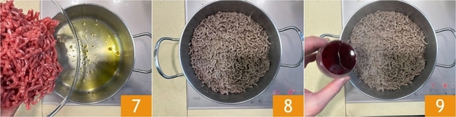 Fügen Sie das Hackfleisch hinzu 7 und lassen Sie es anbraten, bis es die Farbe verändert hat 8. Dann mit dem Rotwein ablöschen 9 und den Alkohol verdampfen lassen.