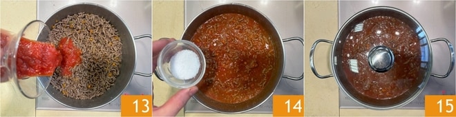 Mit der Tomatenpassata bedecken 13, salzen 14, pfeffern, mit dem Deckel abdecken 15 und bei mäßiger Hitze 90 Minuten kochen.