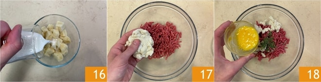 In der Zwischenzeit die Fleischbällchen zubereiten: Das in Würfel geschnittene Brot in Milch einweichen 16, dann gut ausdrücken und in eine andere Schüssel geben, in die Sie das Hackfleisch gelegt haben 17. Fügen Sie den Thymian, den geriebenen Käse, das geschlagene Ei 18 und das Salz hinzu.