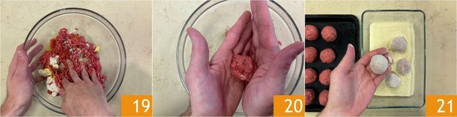 Kneten Sie den Teig mit den Händen 19, um eine homogene Masse zu erhalten, und formen Sie dann walnussgroße Fleischbällchen 20, Sie sollten etwa 12 erhalten. Wälzen Sie die Fleischbällchen nach und nach in Grieß und legen Sie sie auf ein Tablett 21.