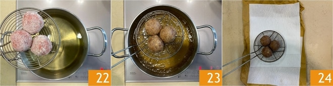 Erhitzen Sie das Pflanzenöl in einem Topf und tauchen Sie, wenn es eine Temperatur von etwa 170°-180°C erreicht hat, die Fleischbällchen ein 22, einige auf einmal, und braten Sie sie, bis sie goldbraun sind 23. Die Fleischbällchen auf einem mit Küchenpapier ausgelegten Tablett abtropfen lassen, um das überschüssige Öl zu entfernen 24.
